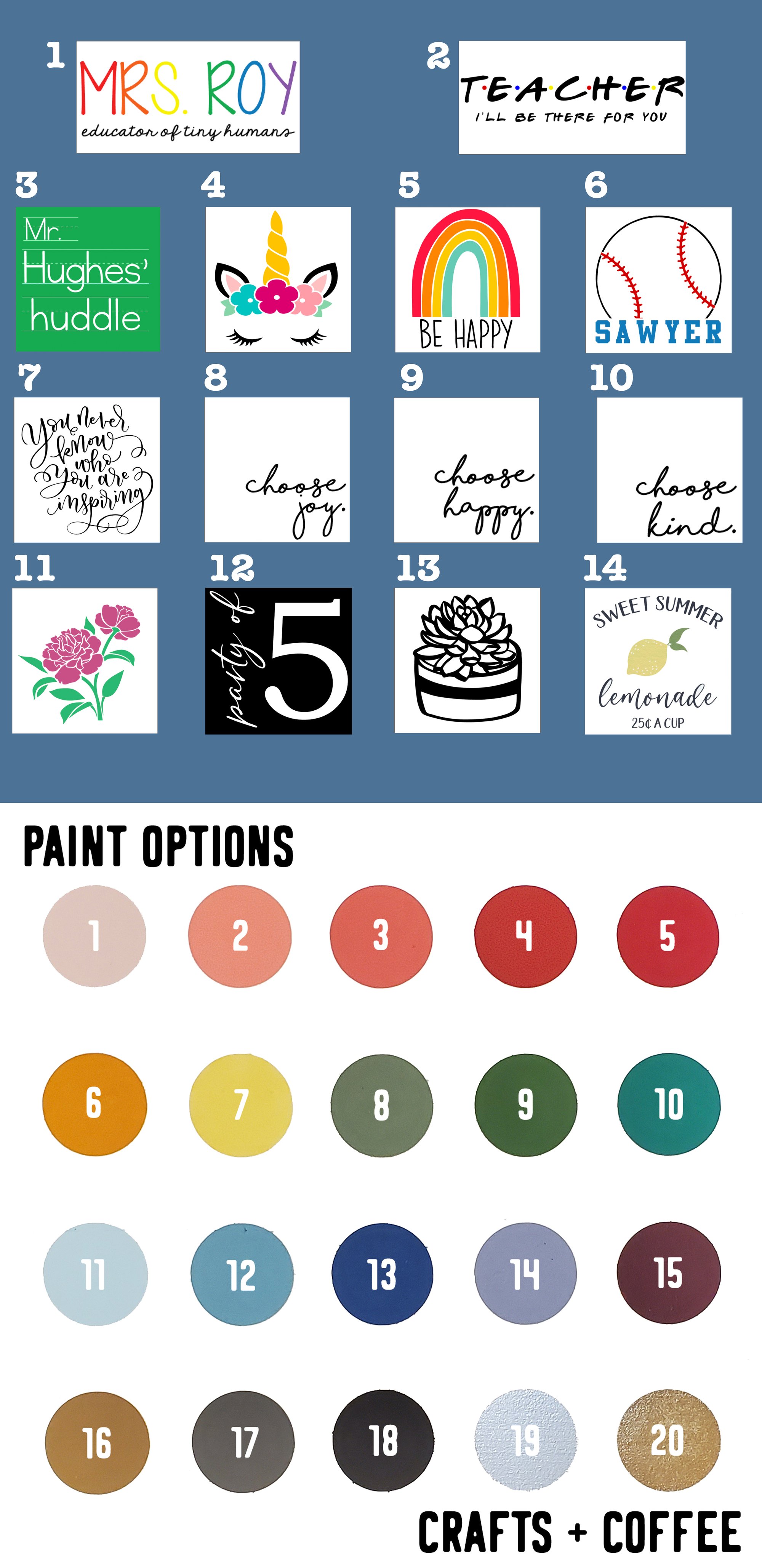 Paint color options (be sure to include up to 3 paint color choices AND let us know your background color choice!)